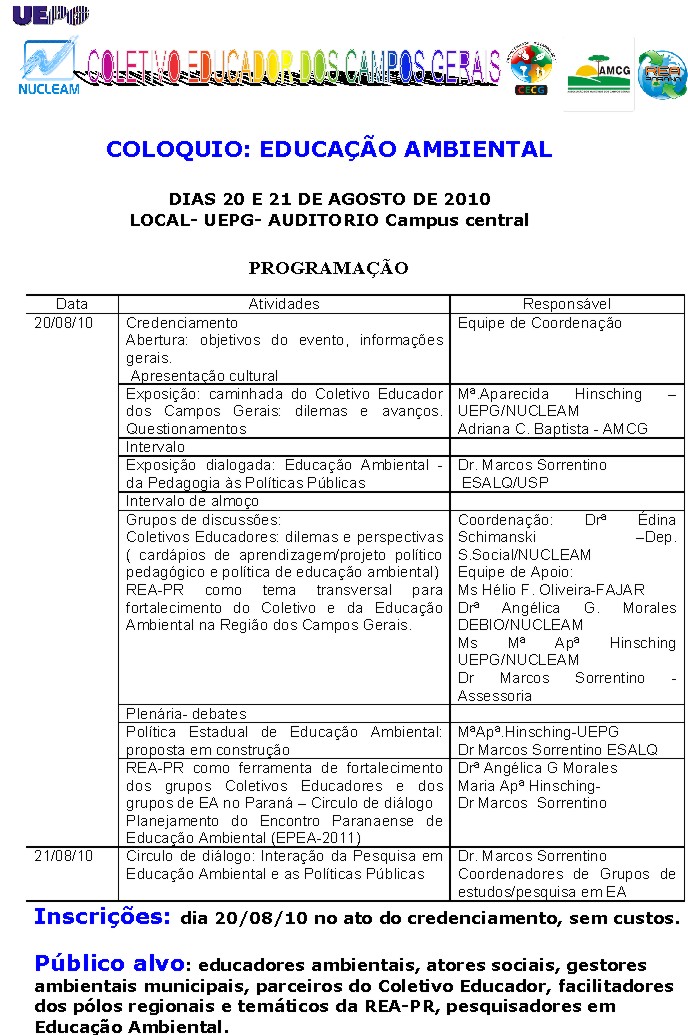Segue abaixo a divulgação completa do Colóquio de Educação Ambiental com todos os patrocinadores, o evento contará com a presença do Dr. Marcos Sorrentino nos dias 20 de agosto com credenciamento e início das palestras nos horários das 8:00 da manhã até as 18:00 da tarde e no dia 21 de agosto somente pela manhã das 8:30 às 11:30.